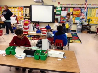 At snack time, the kids has a Suess inspired snack thanks to Andrea and Megan, our room parents. It was inspired by Hop on Pop, Green Eggs and Ham, 1 Fish 2 Fish Red Fish Blue Fish, The Lorax and Cat in the Hat. The kids loved it! They also received Cat in the Hat hats and pencils.
